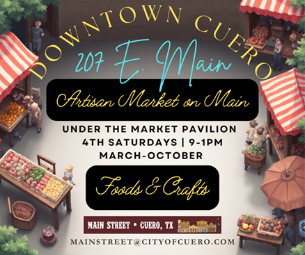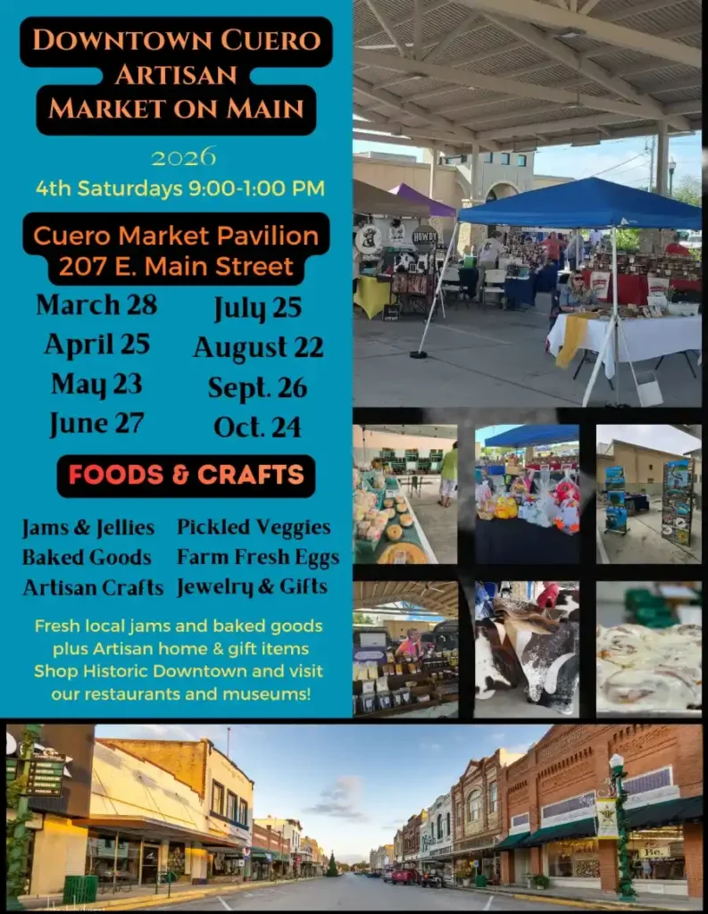 Under the shaded Market Pavilion at 207 E. Main, visit the Downtown Cuero Artisan Market on Main, 4TH Saturday of the month from March – October, 9-1PM.